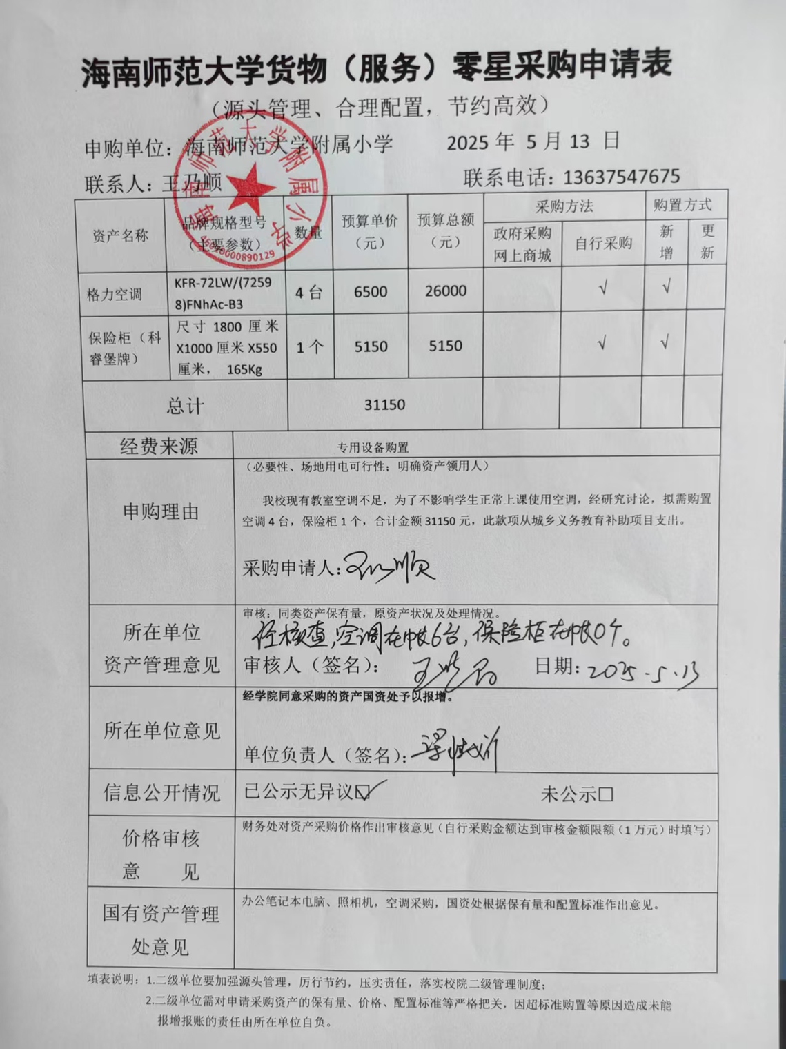 Cool18 现有教室空调不足,为了不影响学生正常上课使用空调,经研究讨论,拟需购置空调4台,保险柜1个,合计金额31150元。