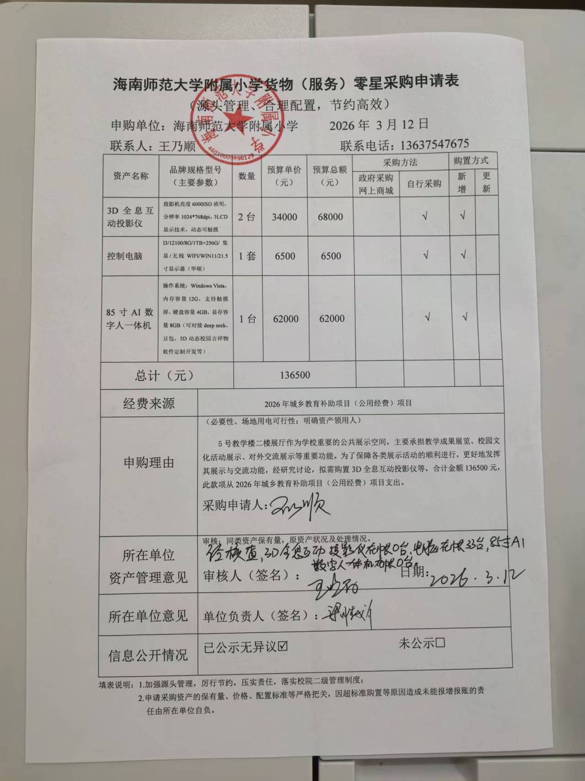 5号教学楼二楼展厅作为学校重要的公共展示空间,主要承担教学成果展览、校园文化活动展示、对外交流展示等重要功能。为了保障各类展示活动的顺利进行,更好地发挥其展示与交流功能,经研究讨论,拟需购置3D全息互动投影仪等,合计金额136500元。